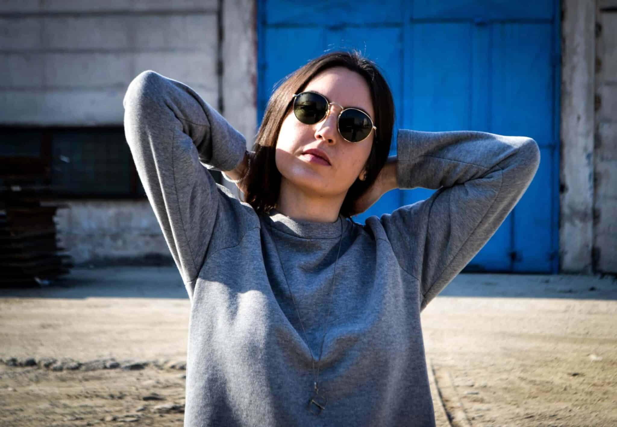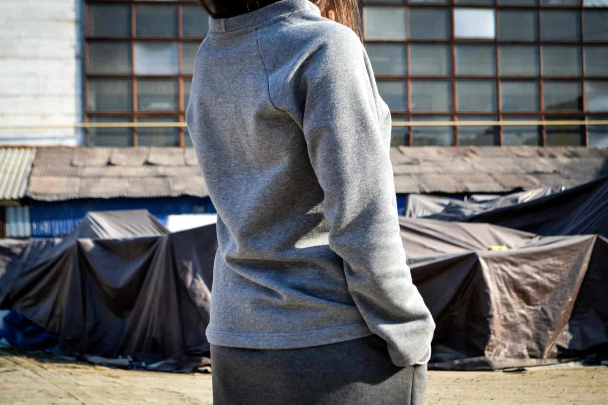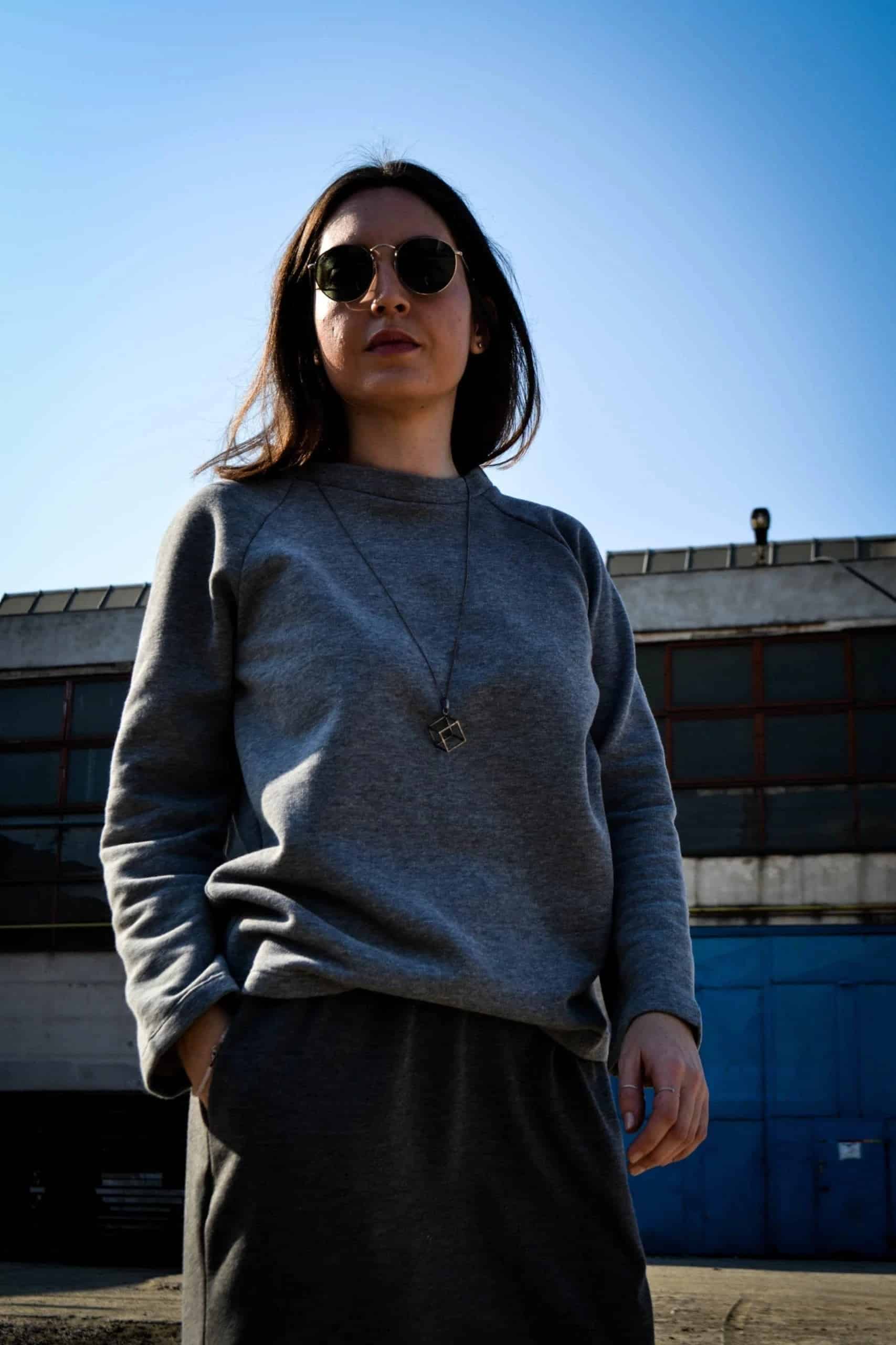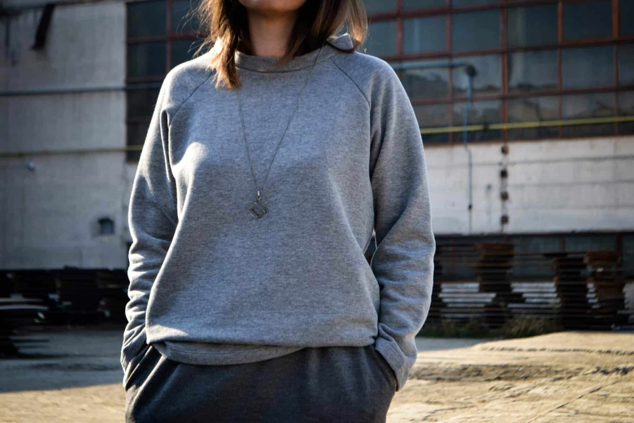 Hanorac cu guler tip raglan din jerseu gros, culoare gri deschis; materialul este moale, plăcut la atingere, călduros, ideal pentru sezonul rece, fiind flaușat la interior. Hanoracul are o croială dreaptă, guler larg, cu tentă sport. Se potriveșteatât în combinații casual cât și mai elegante.