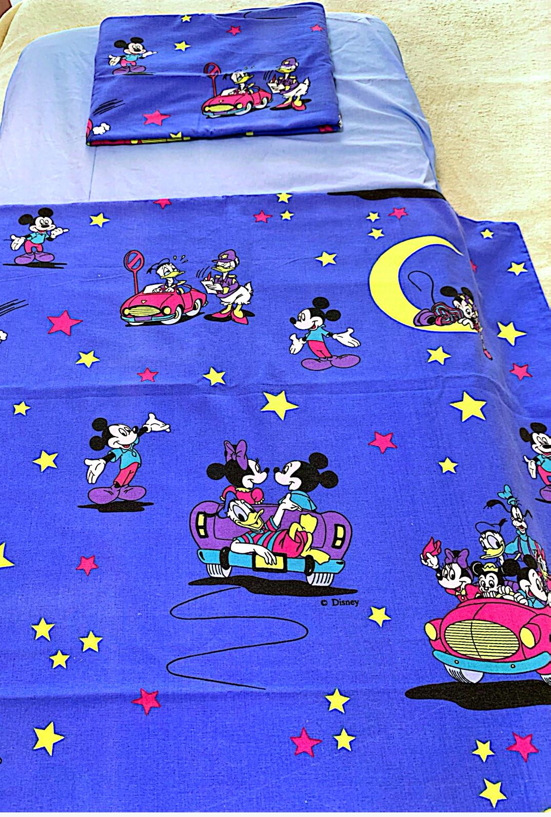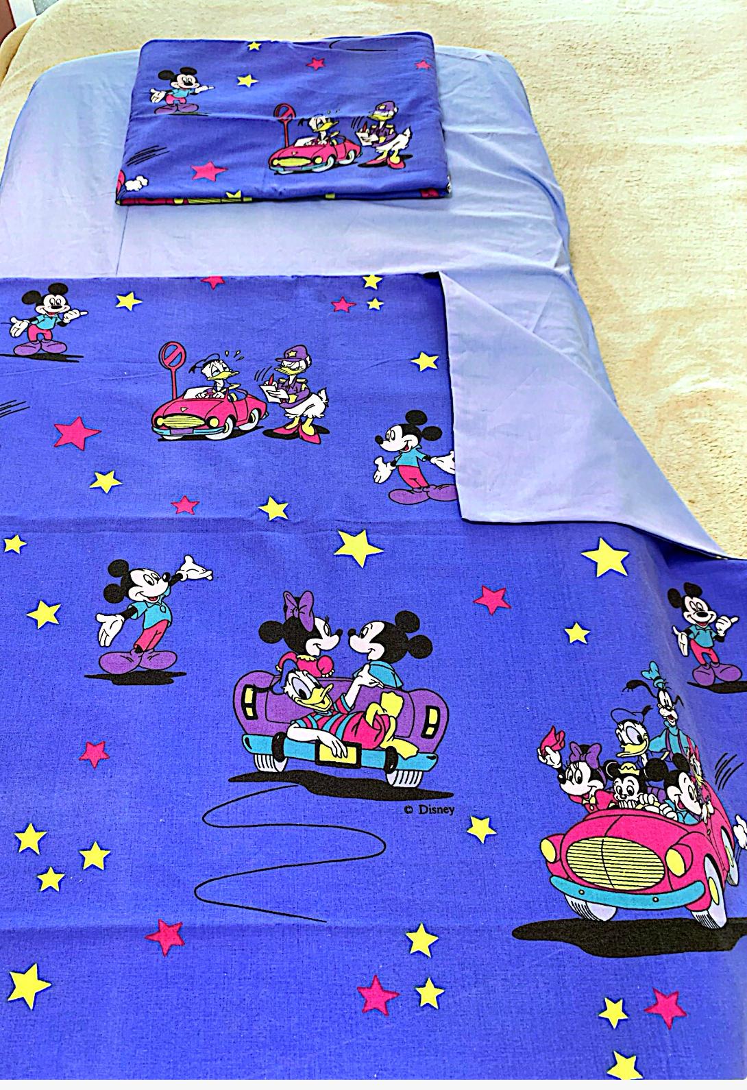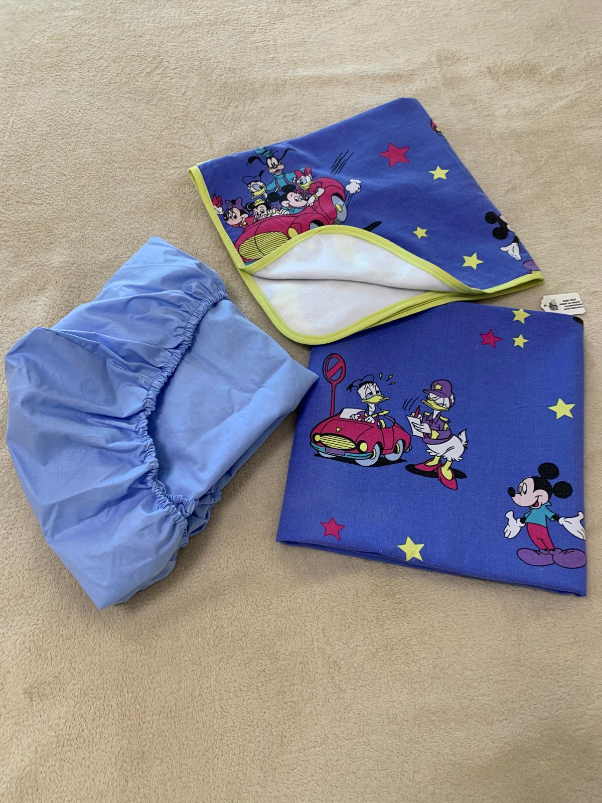 Set lenjerie pentru patut bebe,in combinatii de culori placute,albastra cu model Mikey,include 4 piese ,husa pilota , husa salteluta, fata pentru pernuta si paturica
