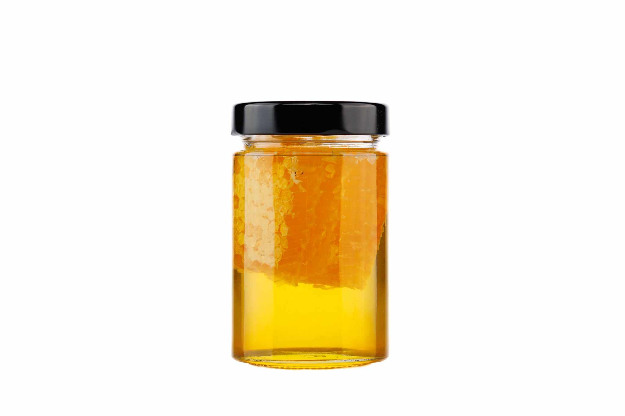 Savurează o linguriță de miere cu fagure direct din borcan pentru o gustare sănătoasă și revigorantă.