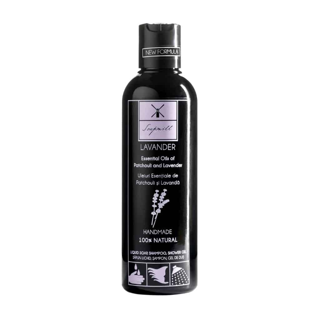 Lavender Săpun lichid, Șampon, Gel de duș Formula noua cu efect 3 in 1 conține un complex de ingrediente active de origine naturală: Extract din rădăcină de Scutellaria baicalensis Georgi cunoscut sub numele de gura-lupului chinez, Extract de soia, Extract de germenii de grâu, apa de lavandă organică, alantoină, glicerina vegetală și panthenolul (provitamina b5) bogate în substanțe nutritive, vitamine și minerale fiind benefice pielii foarte uscate, mature, îmbunătățește elasticitatea și tonusul pielii, catifeleaza pielea redândui aspectul sănătos și puternic. Extractul de salcie care este o sursă naturală de acid salicilic cu proprietăți antiinflamatorii, antimicrobiene, astringente şi antiseptice ajută la reducerea secreției excesive de sebum cu acțiune anti-mătreață. Moment prețios de relaxare și calmare „Lavender” îmbină în mod unic uleiurile esențiale de lavandă și patchouli cu parfumul floral tiare natural.