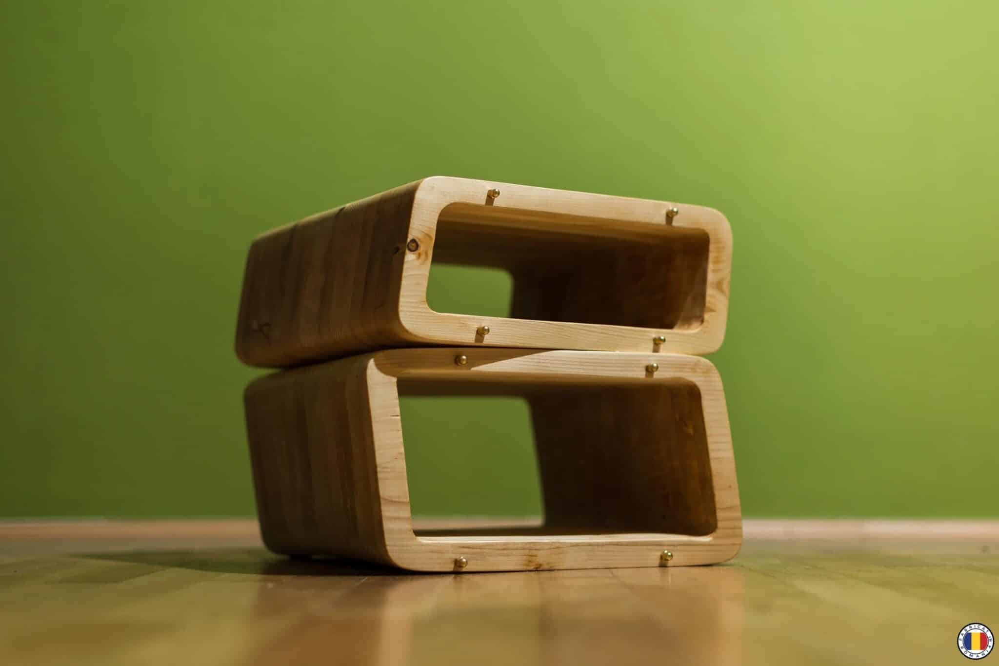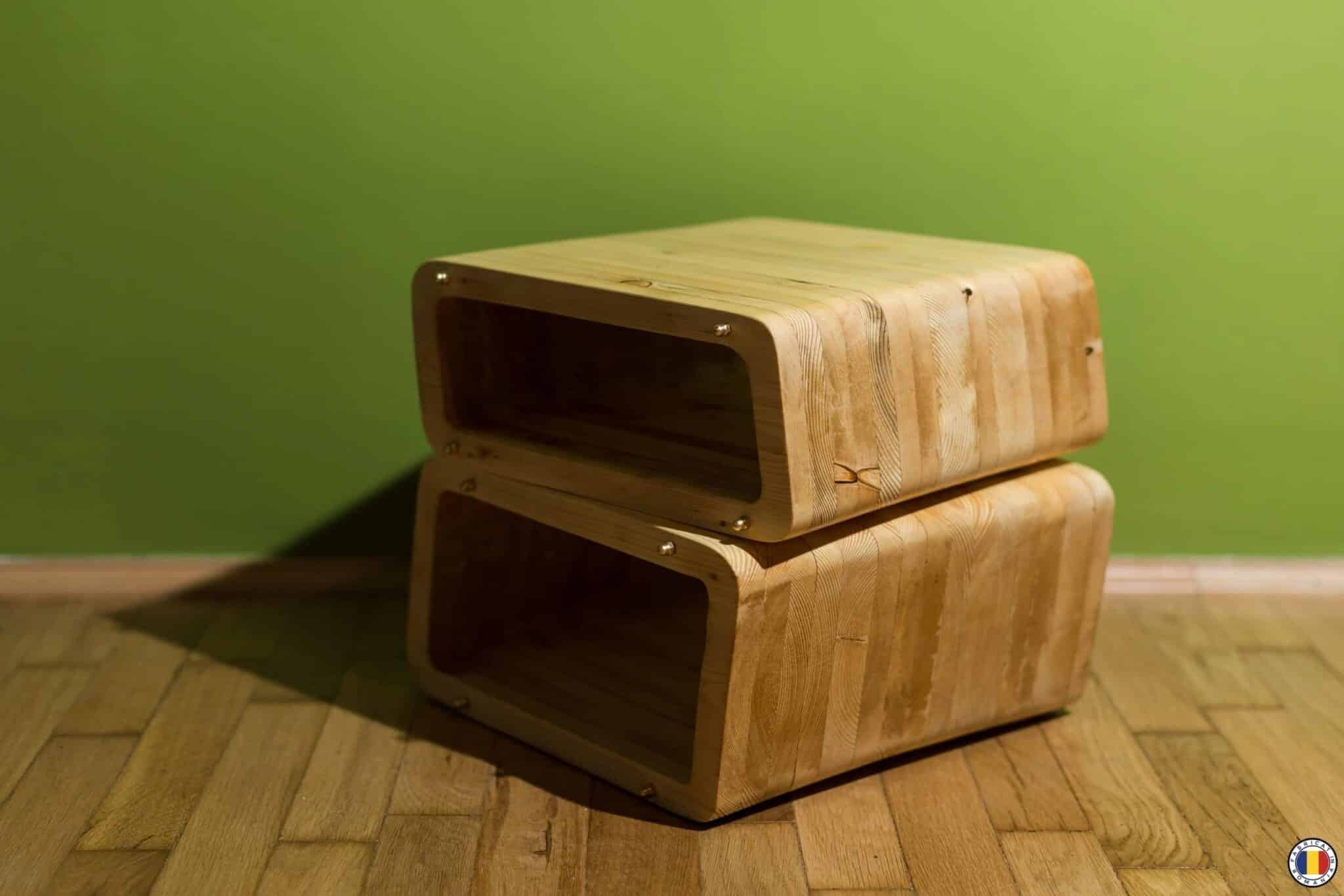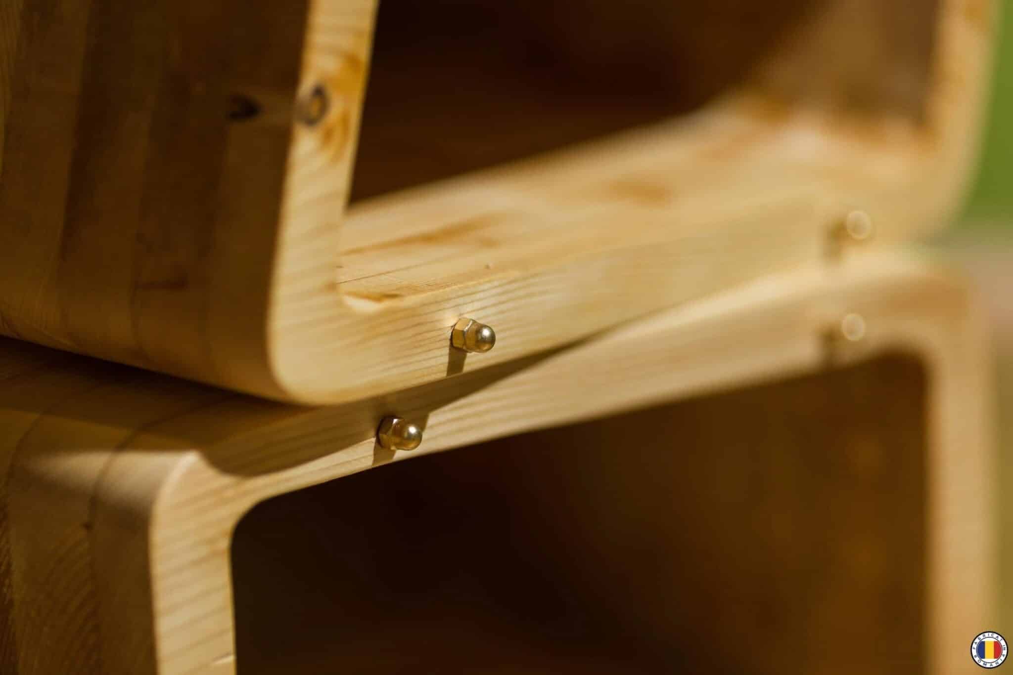 “Radoo” este un taburet din lamele de brad, frezate după şablon şi apoi lipite în presă. Textura şi culoarea sunt lăsate natur, taburetul fiind tratat numai cu ulei natural. Ca şi detaliu şi accent, am folosit piulite din alamă, cu cap înfundat.